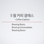 5월에는 브루잉 베이직스, 브루잉 인터미디어트, 로스팅 베이직스 클래스가 각 1회차씩 열립니다. 아래의 내용을 참고해주시면 좋겠습니다. 감사합니다. 클래스 안내 1. 브루잉 베이직스 (Brewing Basics) 브루잉 베이직 클래스는 핸드드립 커피 추출에 대한 기본적인 이론을 통합적으로 이해하고 시음하며, 질의응답으로 풀어가는 형태입니다. 전문 바리스타로 성장하기 위한 사람과 커피를 취미로 하지만 이론적/체계적으로 배우기 원하시는 분을 위한 자리입니다. 강의 내용 자세히 알아보기 2. 브루잉 인터미디어트 (Brewing Intermediate) 브루잉 베이직스 참석자만 들을 수 있는 다음 과정입니다. 베이직스에서 다룬 내용을 바탕으로 분쇄 입자 분포 및 추출수의 온도에 따른 추출의 특성 등 브루잉에 영..
